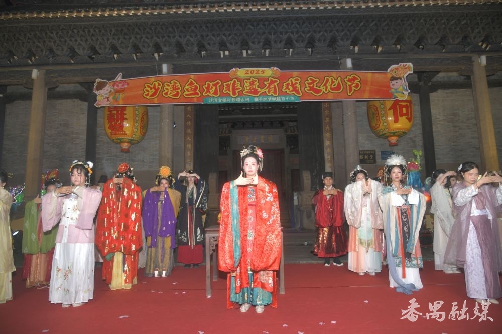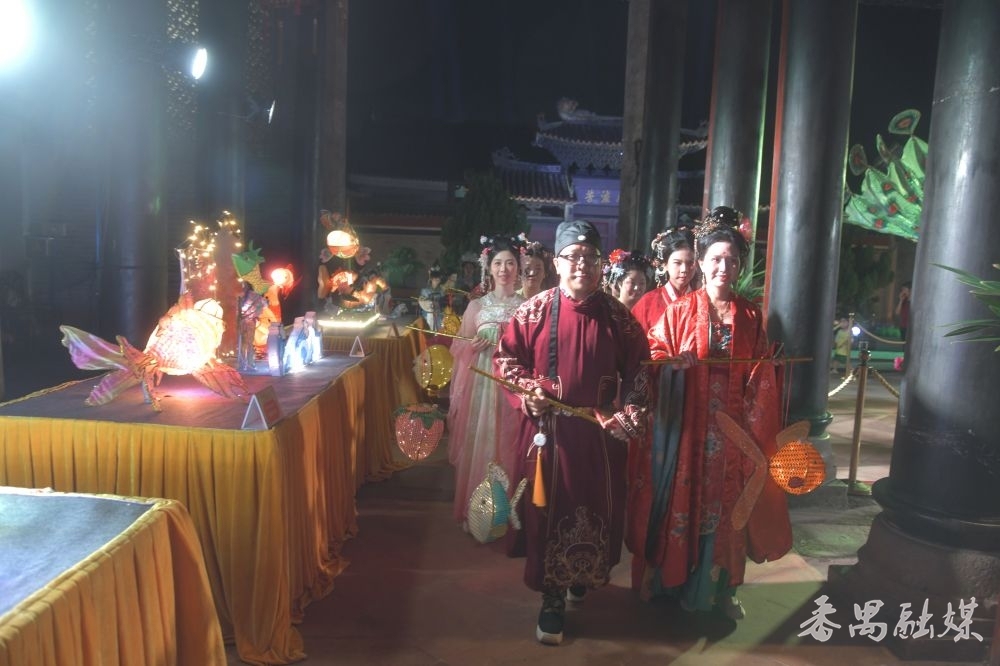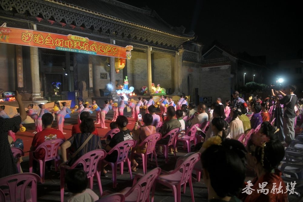 岭南囍事文化团队带来的“天涯共此时·月满沙湾情”迎月仪式,融合击鼓、上供、祈福、拜月等传统环节,重现中秋古礼,场面庄重而温馨。其间,象贤堂内上演独舞《明月几时有》,舞姿翩跹,呼应明月,吸引了不少游客驻足观看。仪式结束后,数十位汉服爱好者手提鱼灯从留耕堂出发,围绕古镇开展迎月提灯巡游,点亮沙湾夜色,将活动推向高潮。